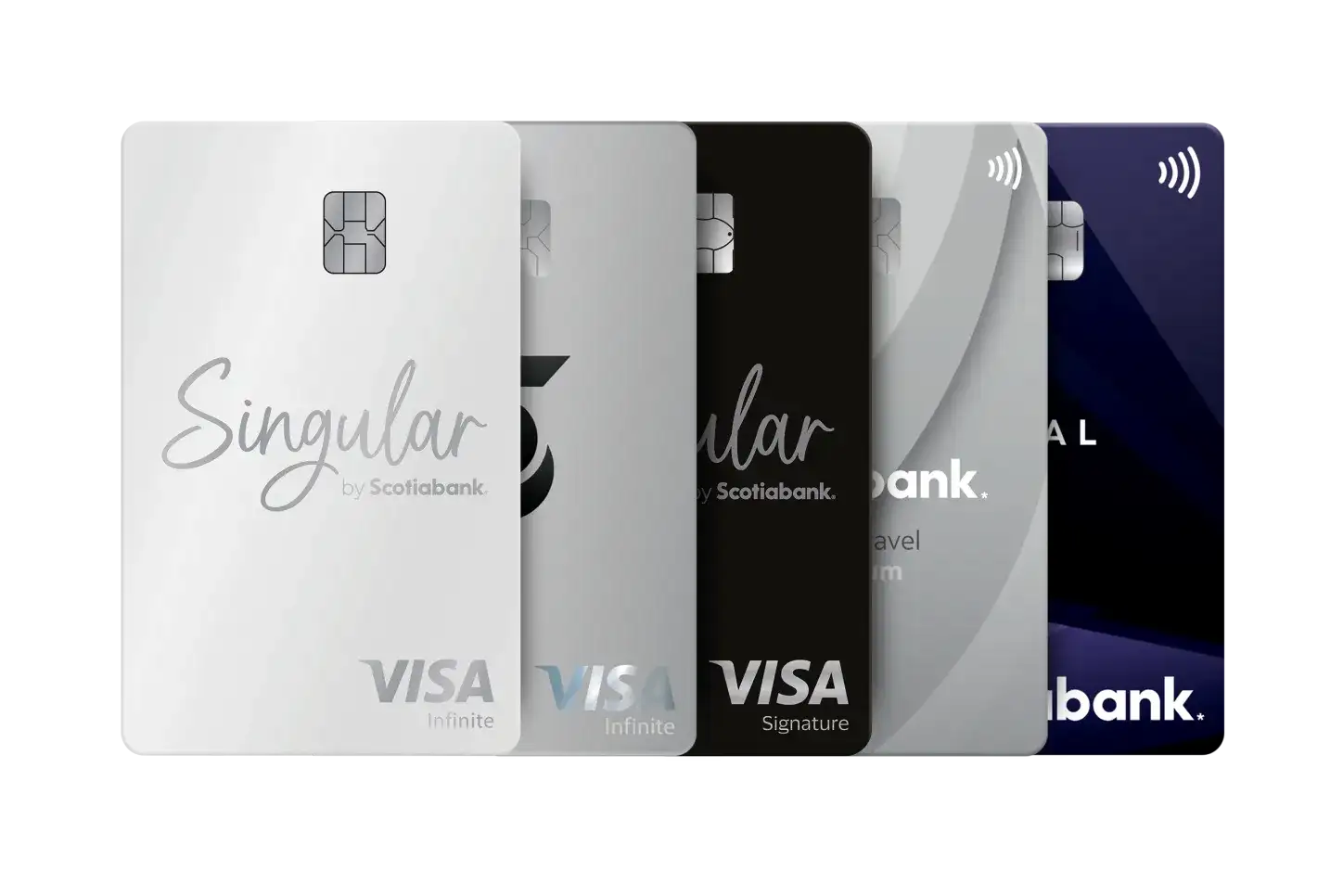 Tarjeta de Crédito IDEAL Scotiabank, Scotia Travel Clásica, Scotia Travel Oro, Scotia Travel Platinum, Tasa Baja Clásica, Tasa Baja Oro, Infinite Scotia Wealth Management, Singular by Scotiabank Infinite, Singular by Scotiabank Signature, Singular by Scotiabank World Elite.