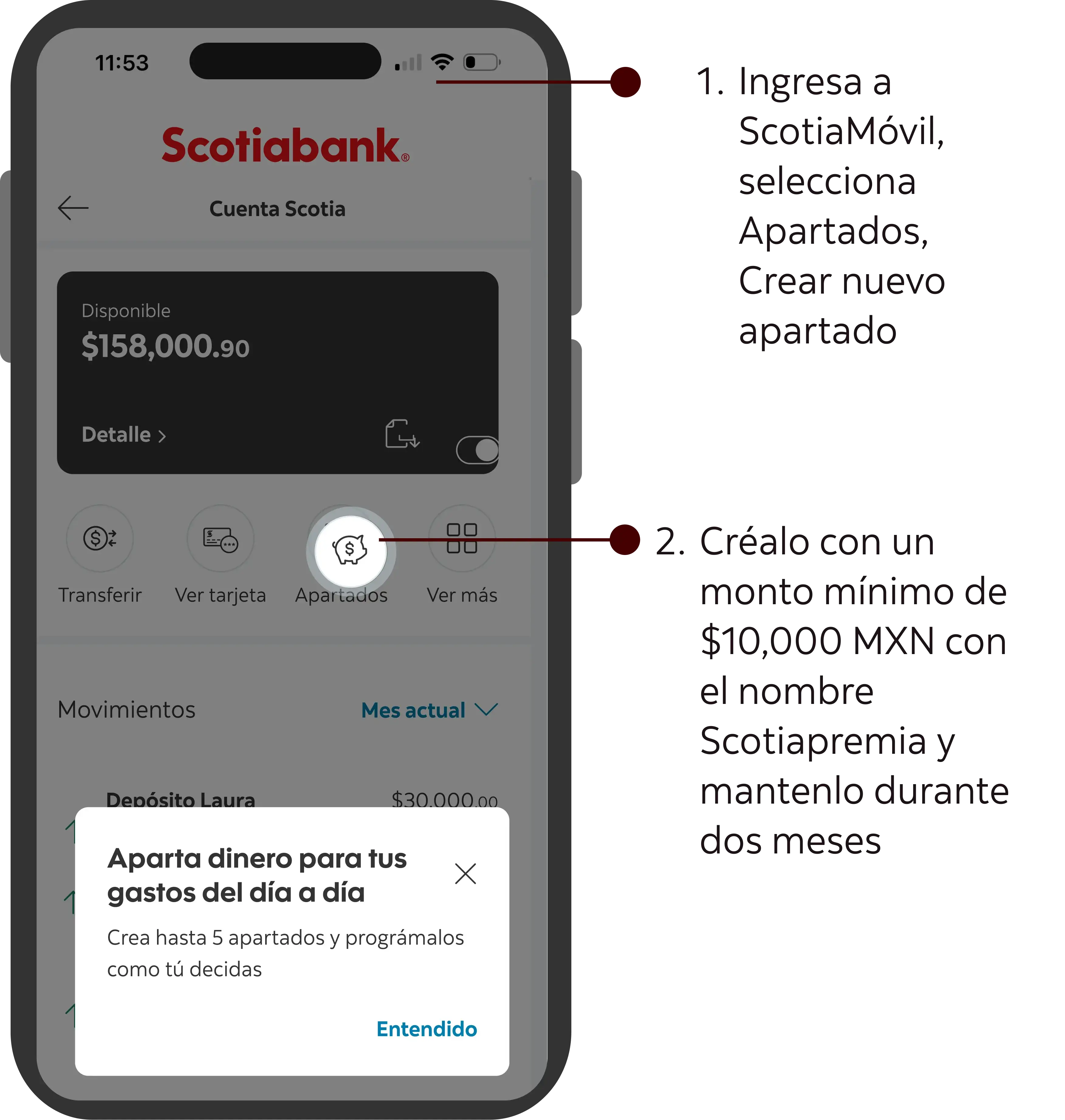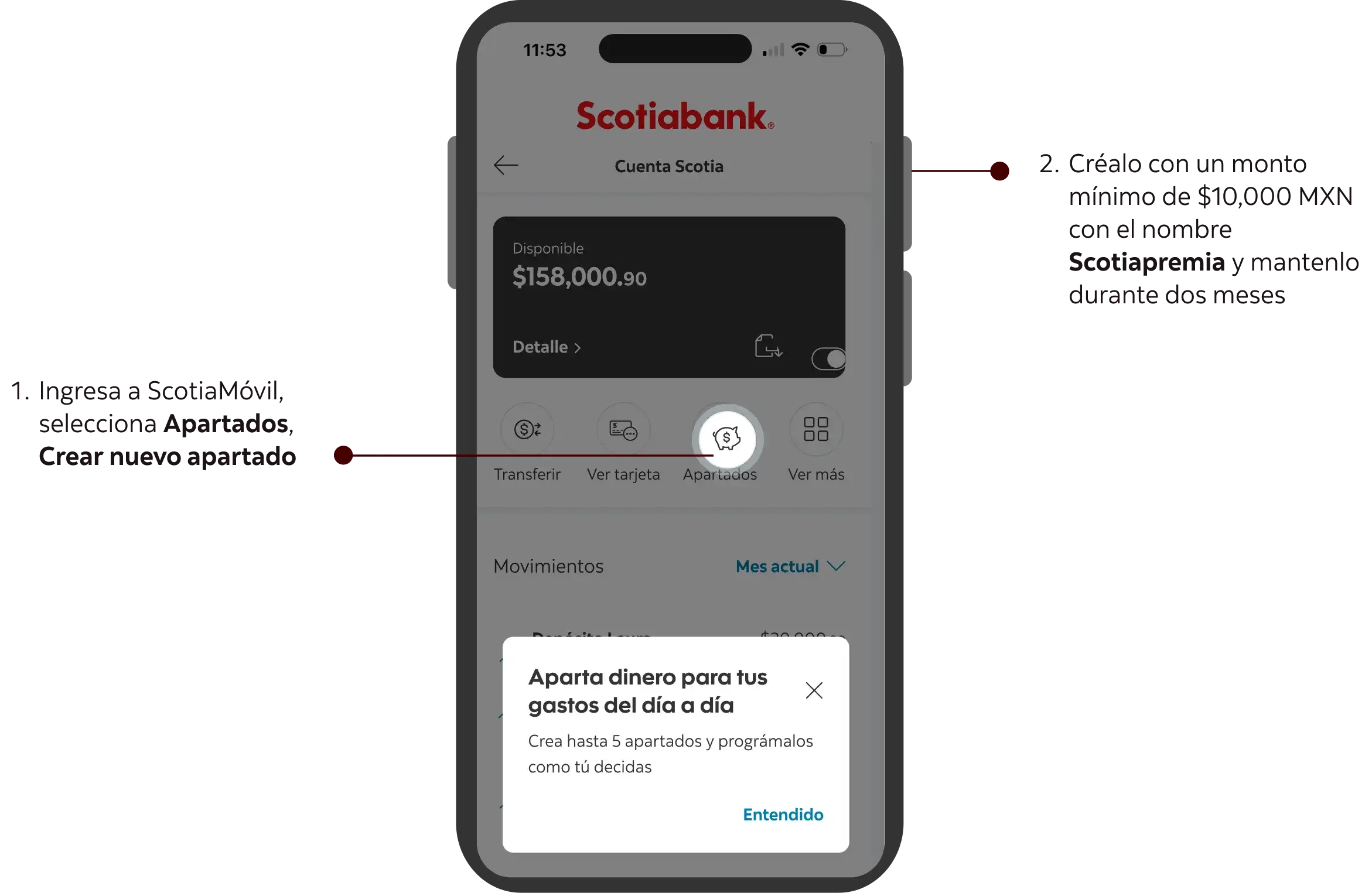 Durante la vigencia de la dinámica los clientes que reciban la invitación vía: SMS, email y Push y realicen su primer apartado con el nombre: Scotiapremia con un monto a partir de $10,000 MXN de saldo promedio mínimo mensual durante la vigencia de la campaña (2 meses cerrados), obtendrán un certificado electrónico Liverpool1. El dinero del apartado deberá ser adicional al saldo promedio de la cuenta.
